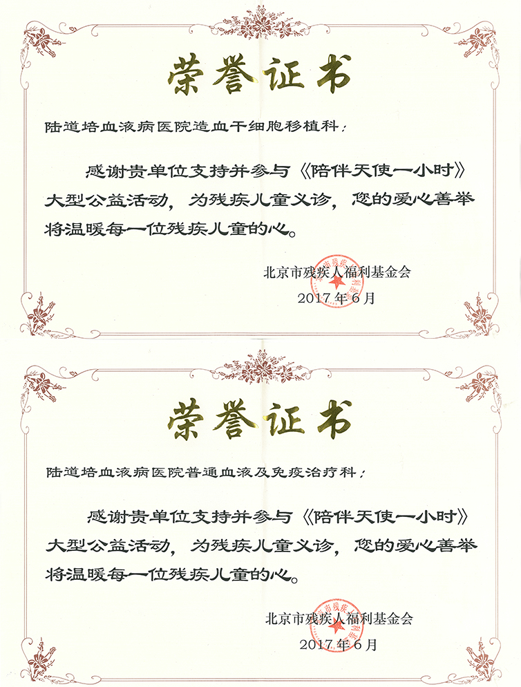 參加了由北京市殘疾人福利基金會(huì)舉辦的《陪伴天使一小時(shí)》大型公益活動(dòng),北京市殘疾人福利基金會(huì)頒發(fā)了榮譽(yù)證書。